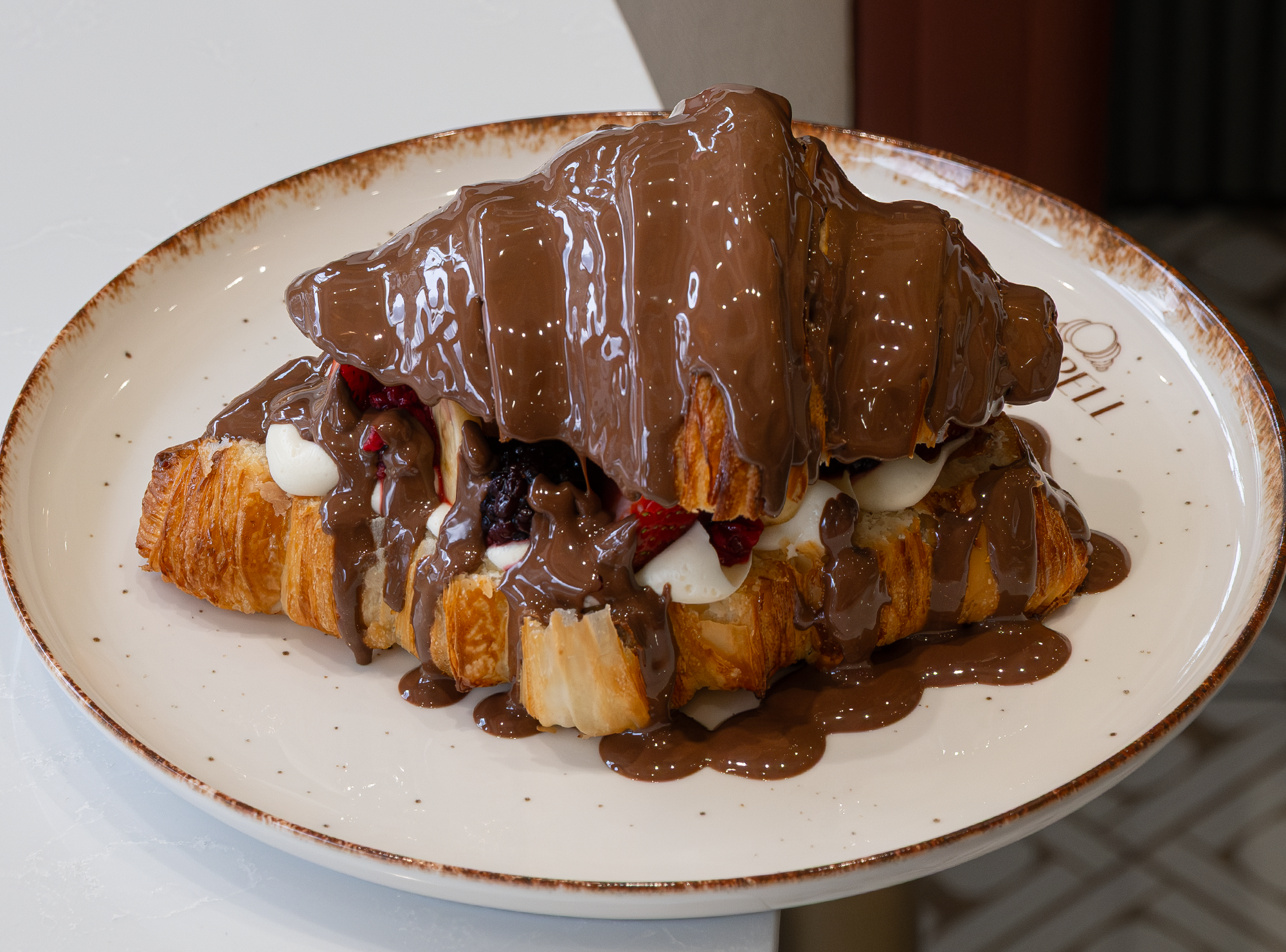 Fransız Krema üzerine Taze Çilek ve Muz, Freeze Fresh Frambuaz ve Böğürtlen, Sütlü Belçika Çikolatası ile...
