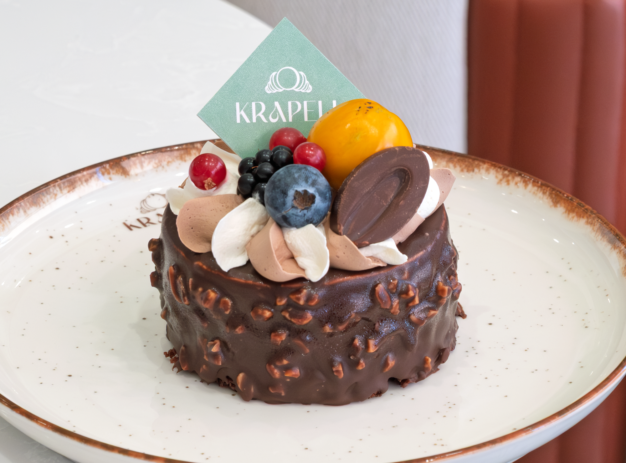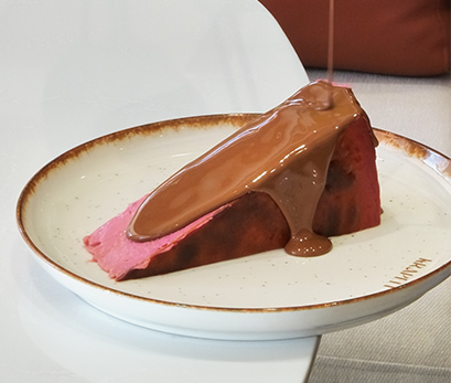 Devil's Kek üzeri Frambuaz Krema, Freeze Fresh Frambuaz ve Yaban Mersini, Nutella Sos ve Frambuaz Sos eşliğinde...