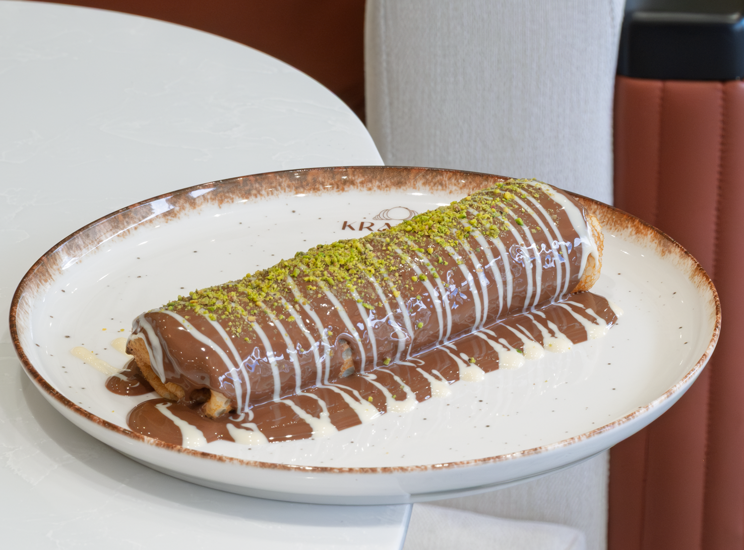 Krep, Fıstıklı Fransız Krema, Muz, Sütlü ve Beyaz Çikolata, Toz Antep Fıstığı ile...