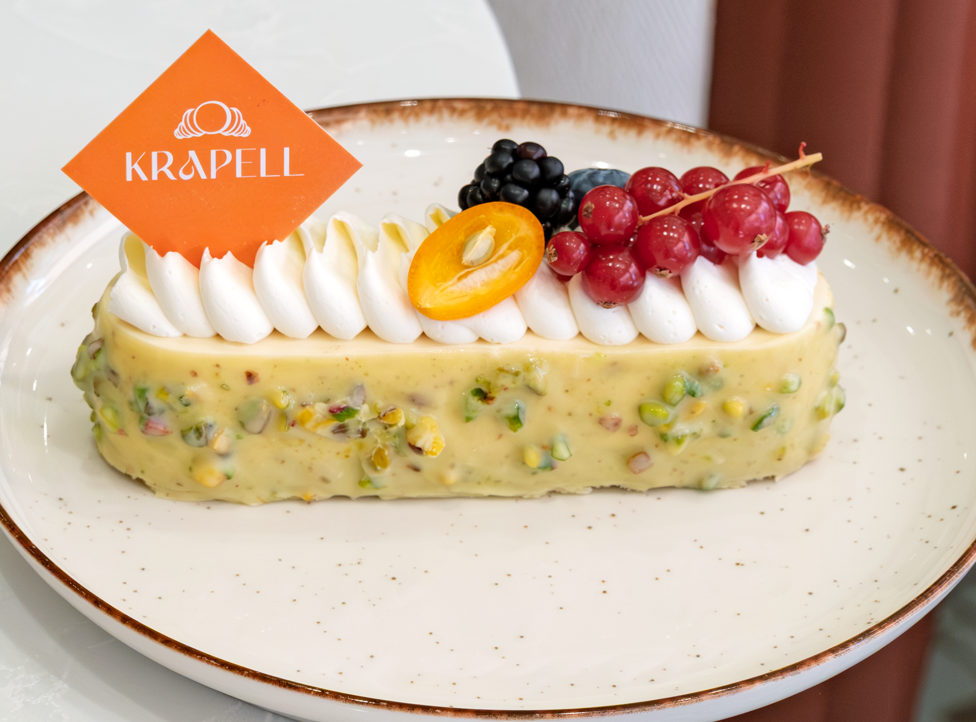 Fıstıklı Sponge Kek, Krema, Akışkan Fıstık Pralin ve Lançop Sos Kaplama...