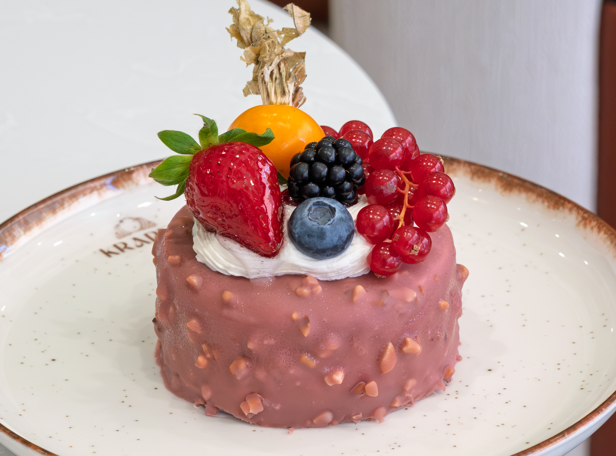 Gerçek Frambuaz formunda, beyaz çikolata kaplama, yoğun frambuaz kreması, frambuaz konfi ve bisküvi tabanı...