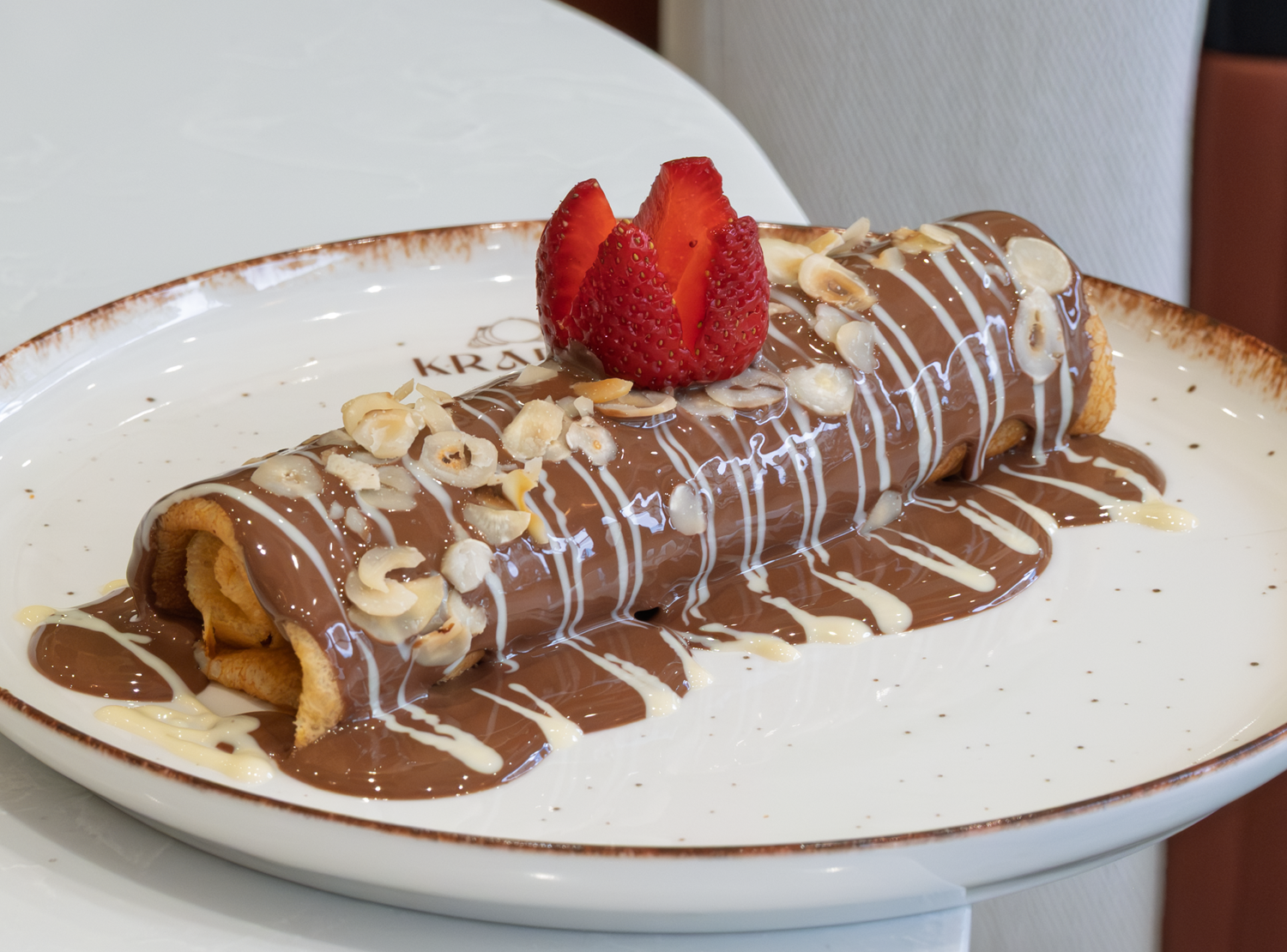 Krep, Fransız Krema, Taze Çilek ve Muz, Parça Yer Fıstığı, Sütlü ve Beyaz Çikolata ile...
