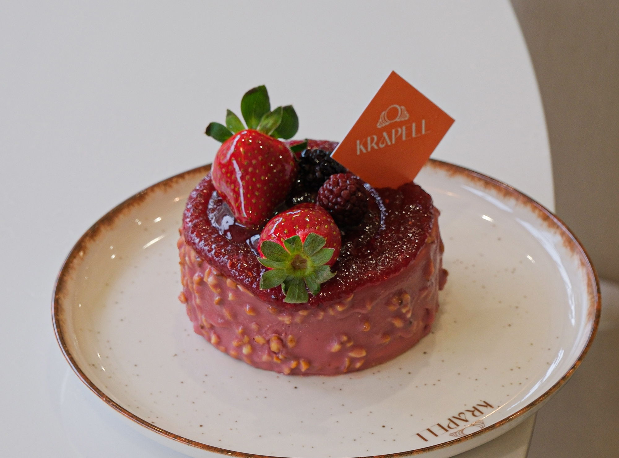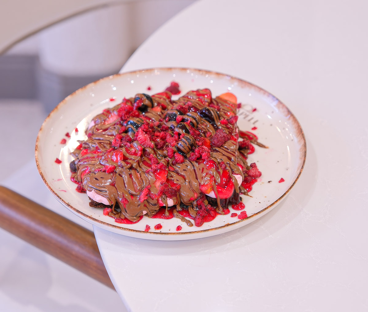 Devil's Kek üzeri Frambuaz Krema, Freeze Fresh Frambuaz ve Yaban Mersini, Nutella Sos ve Frambuaz Sos eşliğinde...