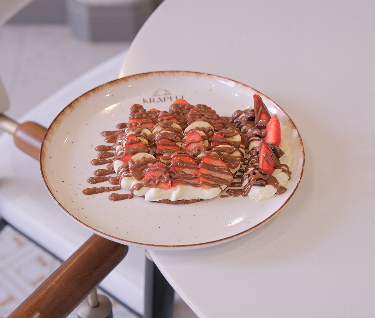 Crunch Çikolata tabanında, Çilek ve Muz, Freeze Fresh Yaban Mersini, Nutella Sos eşliğinde...