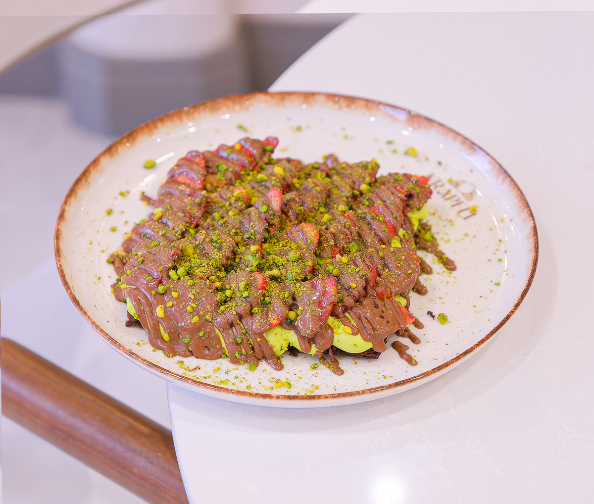 Devil's Kek üzeri Bambu Krema, Çilek, Nutella Sos ve Parça Antep Fıstık eşliğinde...